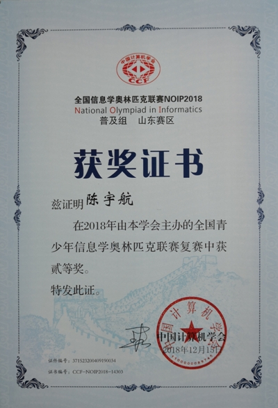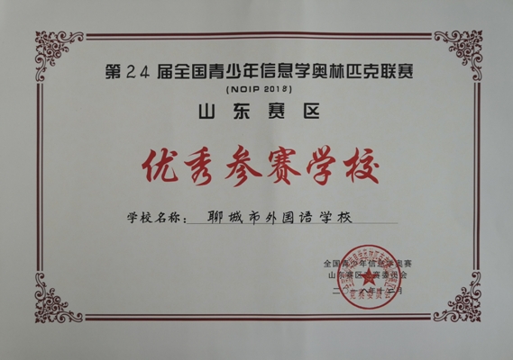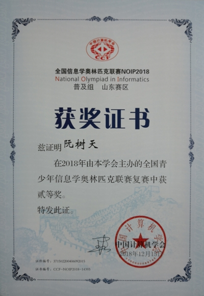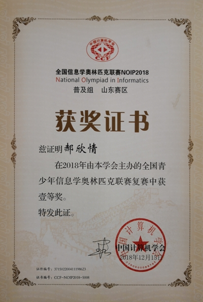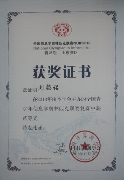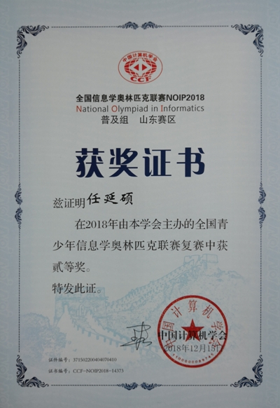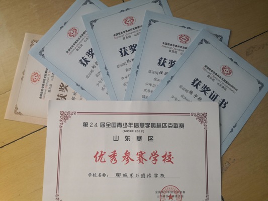 在初三年级宋伟主任的大力支持下,在聊城一中金牌教练赵修彬老师、外国语崔新峰老师的共同努力下,此次,我校中学部初三共有8人参加了第二十四届全国青少年信息学奥林匹克联赛( NOIP2018山东赛区)复赛,并取得了优异的成绩。其中初三、4郝欣情获得普及组一等奖,初三1班 阮树天、初三3班 陈宇航、初三6班 任延硕、初三7班 刘懿铭等4人获得普及组二等奖。