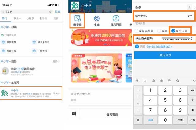 第三步:初次填写需绑定缴费学生信息。请正确输入学生的姓名、身份证号;