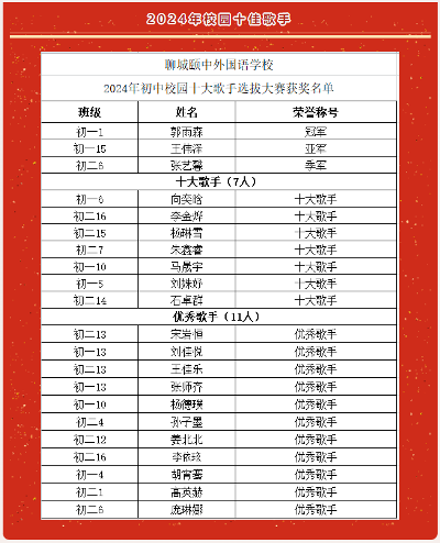 最终以下10位选手脱颖而出,被评为“2024年校园十佳歌手”!