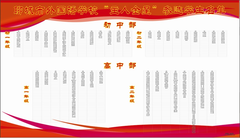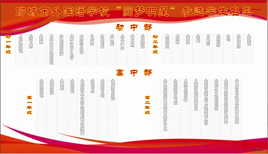 高一“圆梦明星”参选学生名单 邱亚函 吴泽瑜 张云生 栾新宇 齐寒冰 魏世君 栾延彤 李红彬 陈明伍 李昀璐 李文佳 周之颖 闫玉婷 杨亚男 冯永康 夏红玉 陈学智 徐永博 陈大为 徐佳帅 冯俊鹏 李宝龙 杨公栋 丁振鹏 欧阳宏 郑伟昌 赖子威 姚孜铮 郭炳辰 刘舒畅 张军禹 沈文泰 范亚静 李华南 许吉林 刘晓晗 安明扬 王路遥 李新章 杨可欣 田晓涵 盛玉莹 刘国虎 苏珂欣 耿德民 岳思涵 宋美英 董智艺 姜萧萧 赵慧茹 黄子珊 杨潇冉 姜梦奇 刘畅 贾永诚 谢文佳 宋来田 董淑娴 任亚新 窦盛润 苗苑苑 路妍 高颜深 贾姗姗 时瑞婷 吕玉晶 李霄 赵文秀 任萌 周鹏 郭文静 范博文 孙京汉 张建刚 高梅华 孙志茹 杨庆敏 曾世婕 李素青 刘雪莹 孟欣 刘庆博 曹杨荷 张敬轩 宗露露 宋双玉 王亚新 许春芳 翟晓萌 邹爱玲 王鸿 魏雅雯 孙艳鲁 乔君璇 郭清瑶 李佳敏 王族楠 于清添 杨慧琳 苏子远 闫文静 史心如 左景正 赵继虎 刘炳文 杨学辉 董延壮 蒋承端正 董金扬 王小萌 李一凡